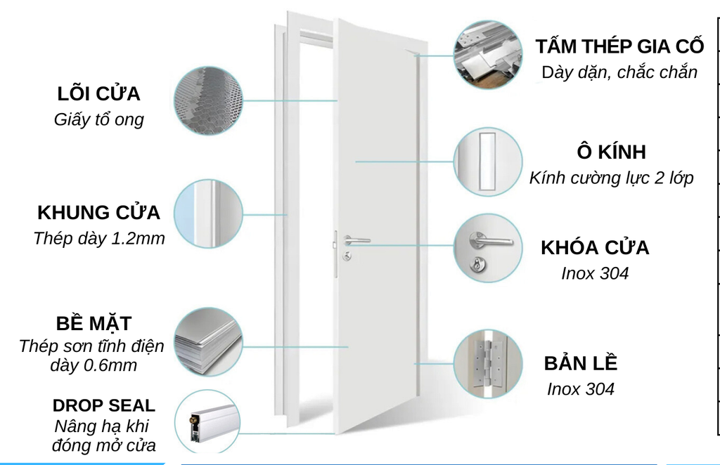 - Lõi cửa sử dụng lõi nhôm tổ ong, giấy tổ ong, lõi bông khoáng, lõi xốp giúp cách âm, cách nhiệt, chống cháy